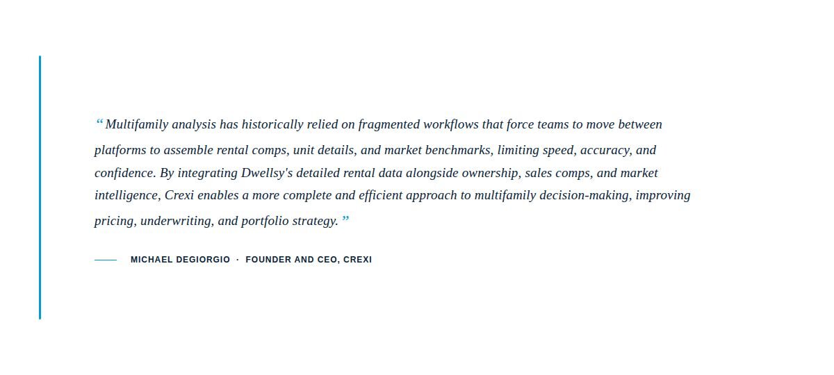 What is the Crexi and Dwellsy partnership? Crexi and Dwellsy have formed a strategic partnership that integrates Dwellsy's rental data directly into Crexi Intelligence. CRE professionals can now access unit-level rent data, sales comps, and ownership records in a single workflow, eliminating the need to toggle between multiple platforms.